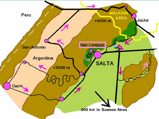 The brown areas on the map are high and dry mountains. Salta was chosen as